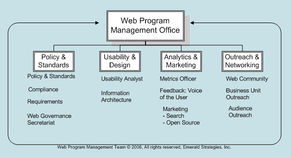 At the program office level, the jurisdiction includes the functional activities of operating an enterprise website. My org chart was, inspired during work at the World Bank with Rob O’Connell, a senior IT auditor. It details functional roles and not necessarily slots.